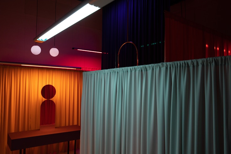 CALM&PUNKの作品も同様で、布という素材を使うことで拡張可能というスケール感も操作できるようなものになればなあと。ドレープも、実際は2メートルとか4メートルとかですが、外まで続いていても別に変わらないというか。横も広がっていくし伸縮するし、あえてちょっと薄い布を使っていたので透けるし。それでまた向こう側が生まれていくというのを得て、自分のなかでより自由度が上がってきています。すべてを説明しきれるわけではないんですけど、CALM&PUNKの展示を経たことで、すごく整理されている状態になりました。