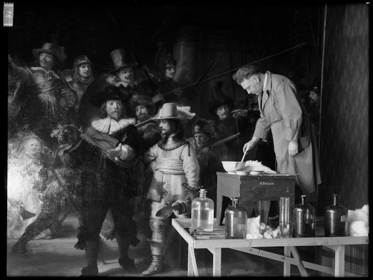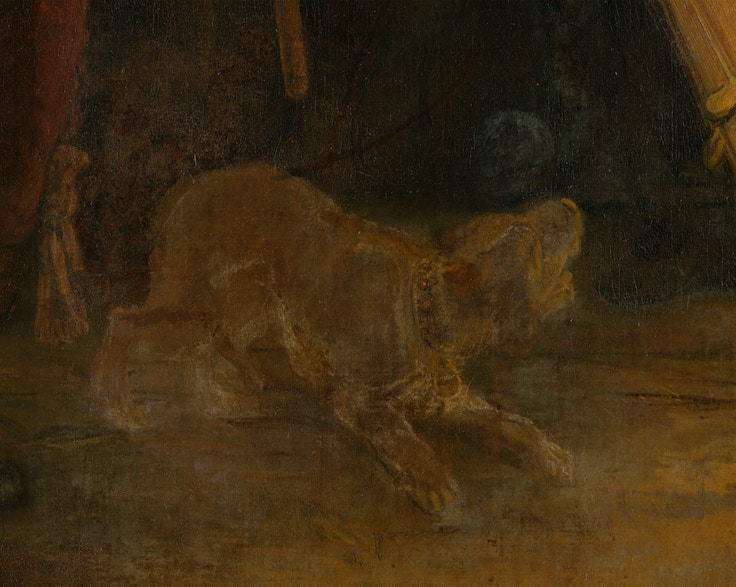 今回、主に修復の対象となっているのは、絵画の右下に描かれた子犬付近の、白ばんでいる箇所。これまで3度にわたり鑑賞者に傷つけられてきた《夜警》だが、1975年のナイフによる損傷によって、この変化が起こっているという。今後、コンピュータによる高度な解析などを経て、適切な対応が検討される。
