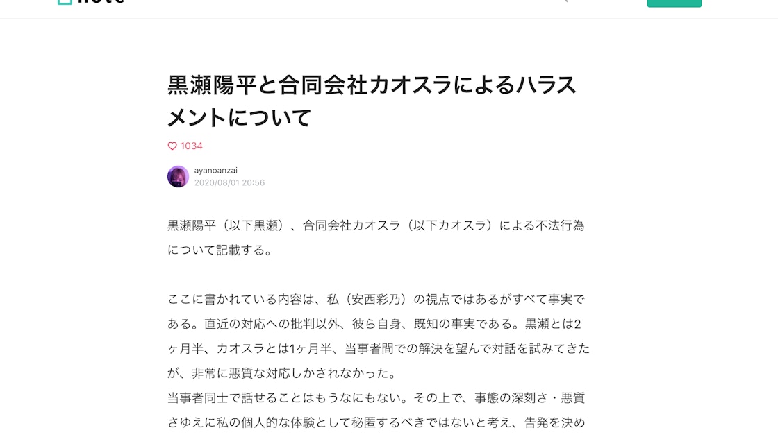 合同会社カオスラの代表社員を務めていた黒瀬陽平が、ハラスメントを行っていたとして退任した件で、被害者の女性が詳細をnoteで公開した。