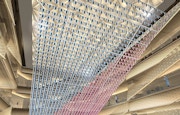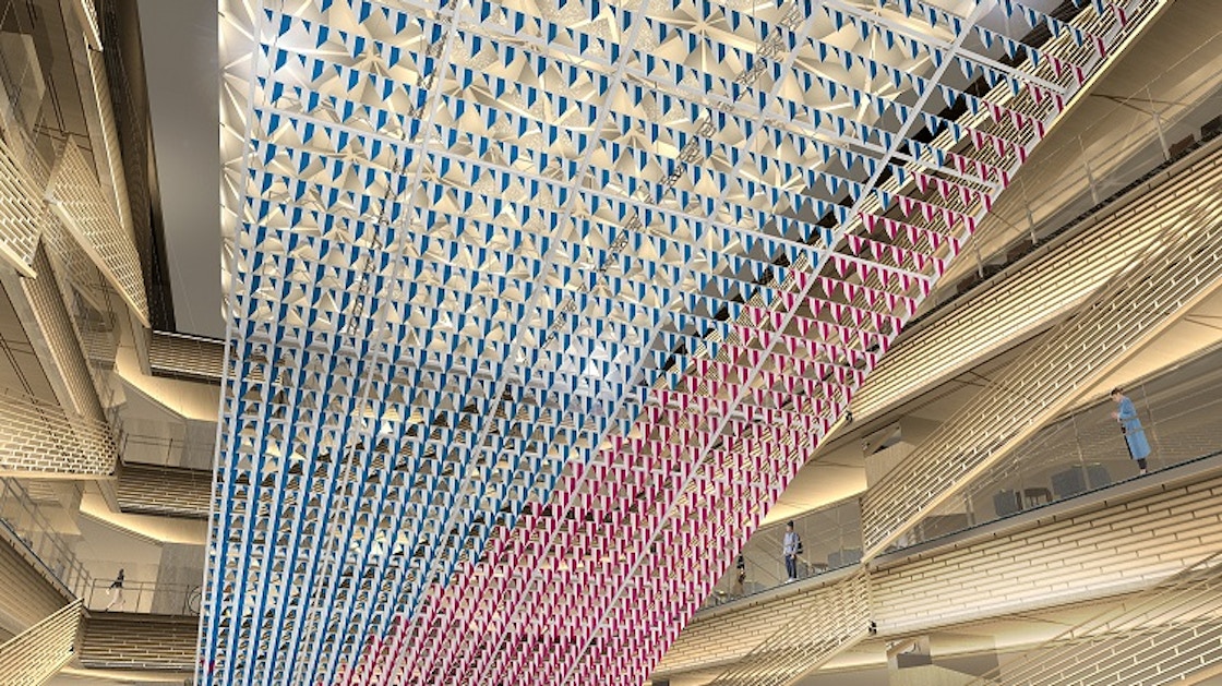 4月2日から展示されるのは、《Like a flock of starlings: work in situ》と題された新作。約9メートル×約19メートルという巨大な本作は、ダニエル・ビュレンのトレードマークである8.7センチのストライプ模様を旗に用いたもの。赤と青の計1500枚の旗によって構成されており、GINZA SIXを彩る(〜10月31日)。