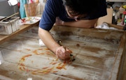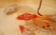 極めて独創的な技法を用いて金魚を描く深堀。器の中に樹脂を流し込み。その表面にアクリル絵の具で金魚を少しずつ部分的に描いていき、更にその上から樹脂を重ねる。この作業を繰り返すことにより、絵が重なり合い、まるで生きているかのような立体感を持つ金魚が表現されるという。